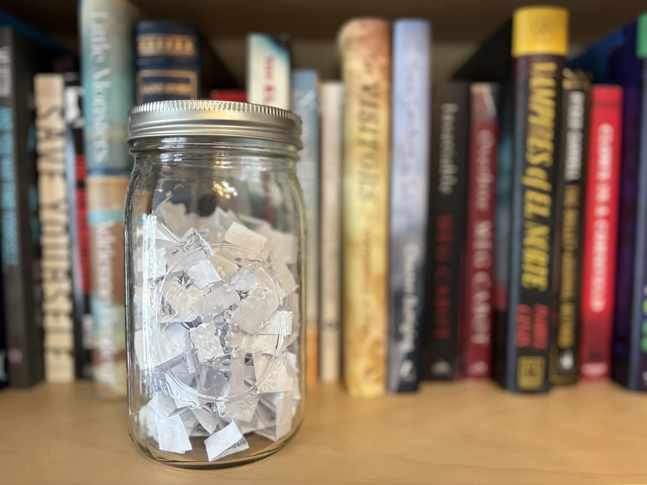 The jar sits on my bookshelf, and once I finish the book I’m currently reading, I plan to shake it up, reach in, and pull out the slip of paper that holds my next read.